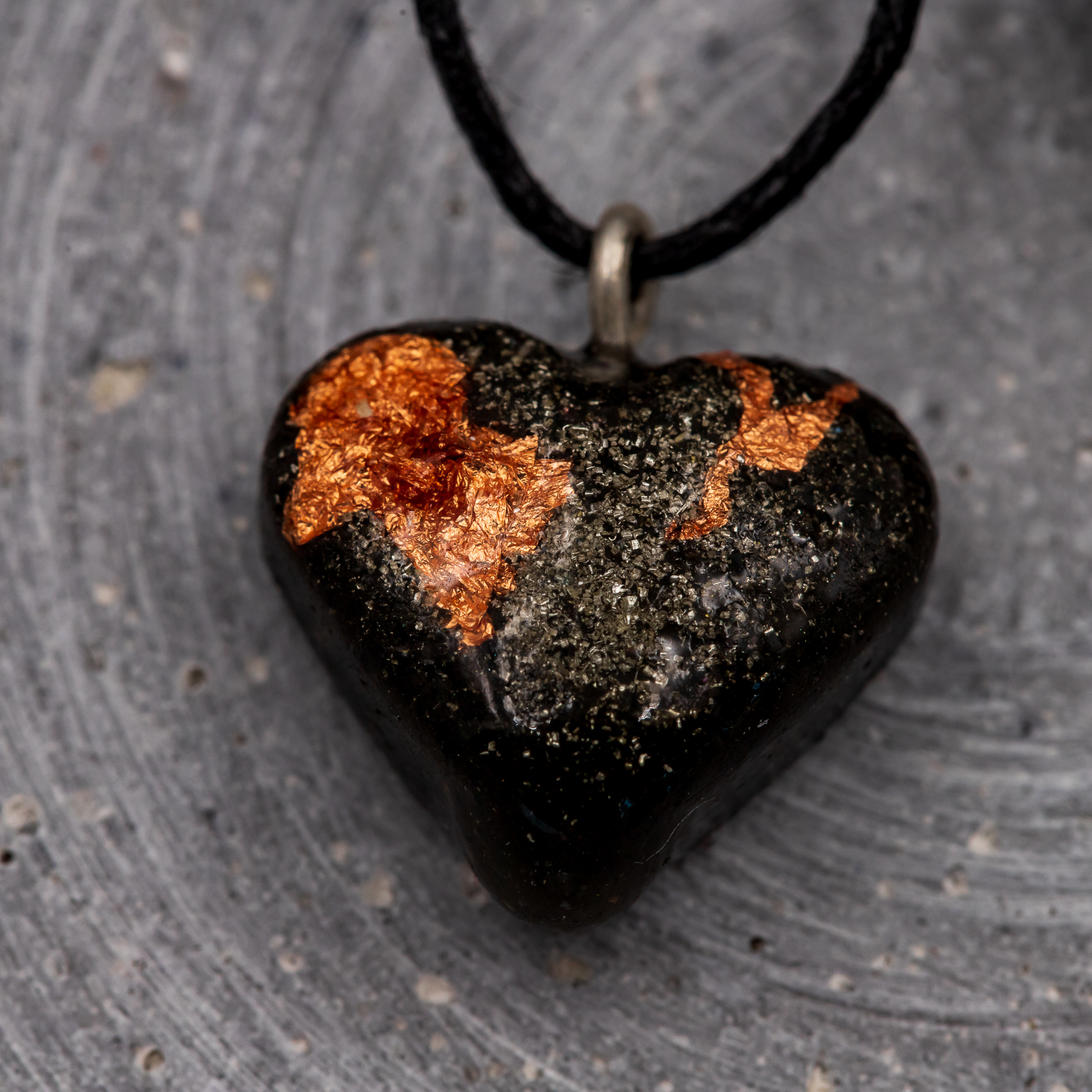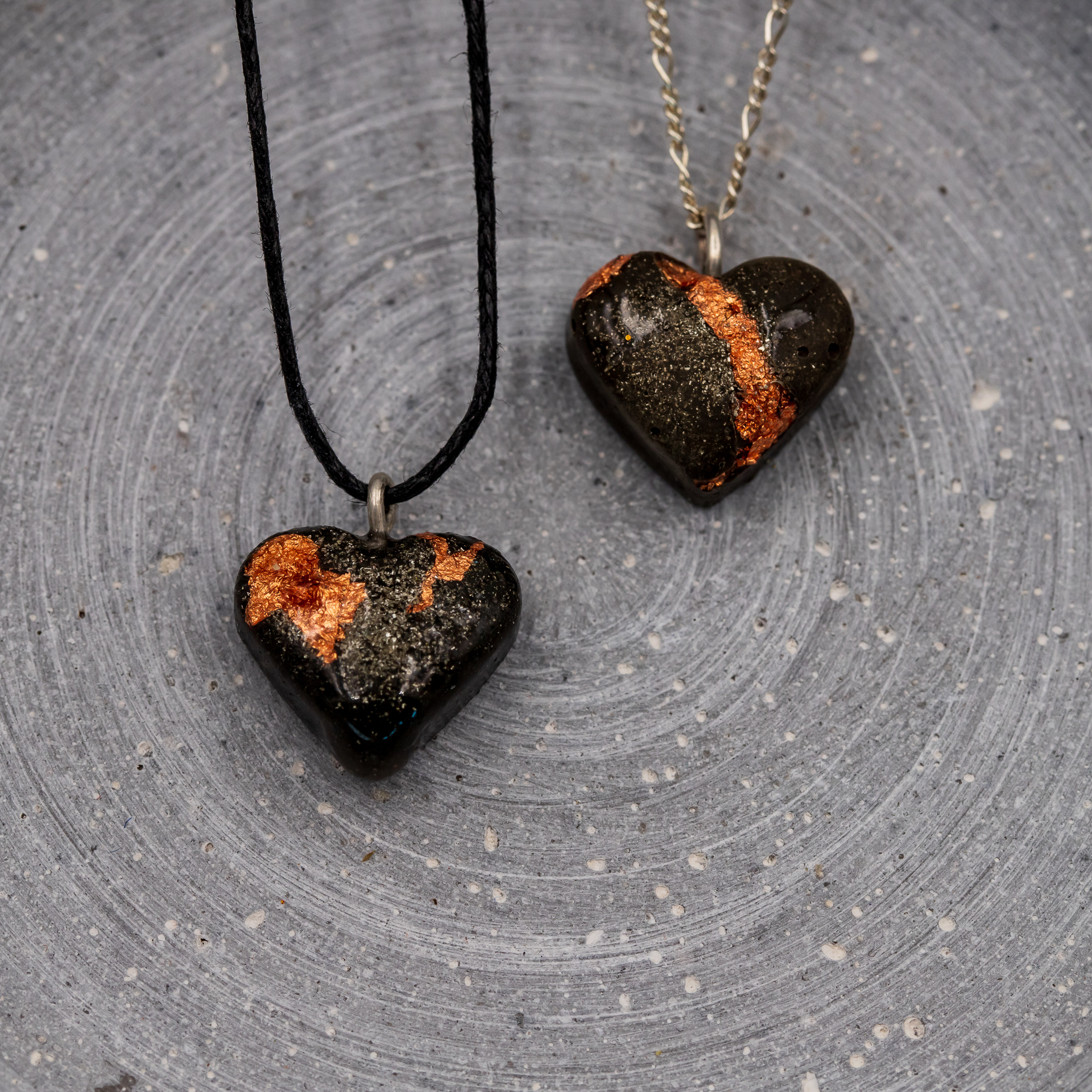 Kette "Betonherzen" aus Beton mit Metallflocken und Silberstaub.