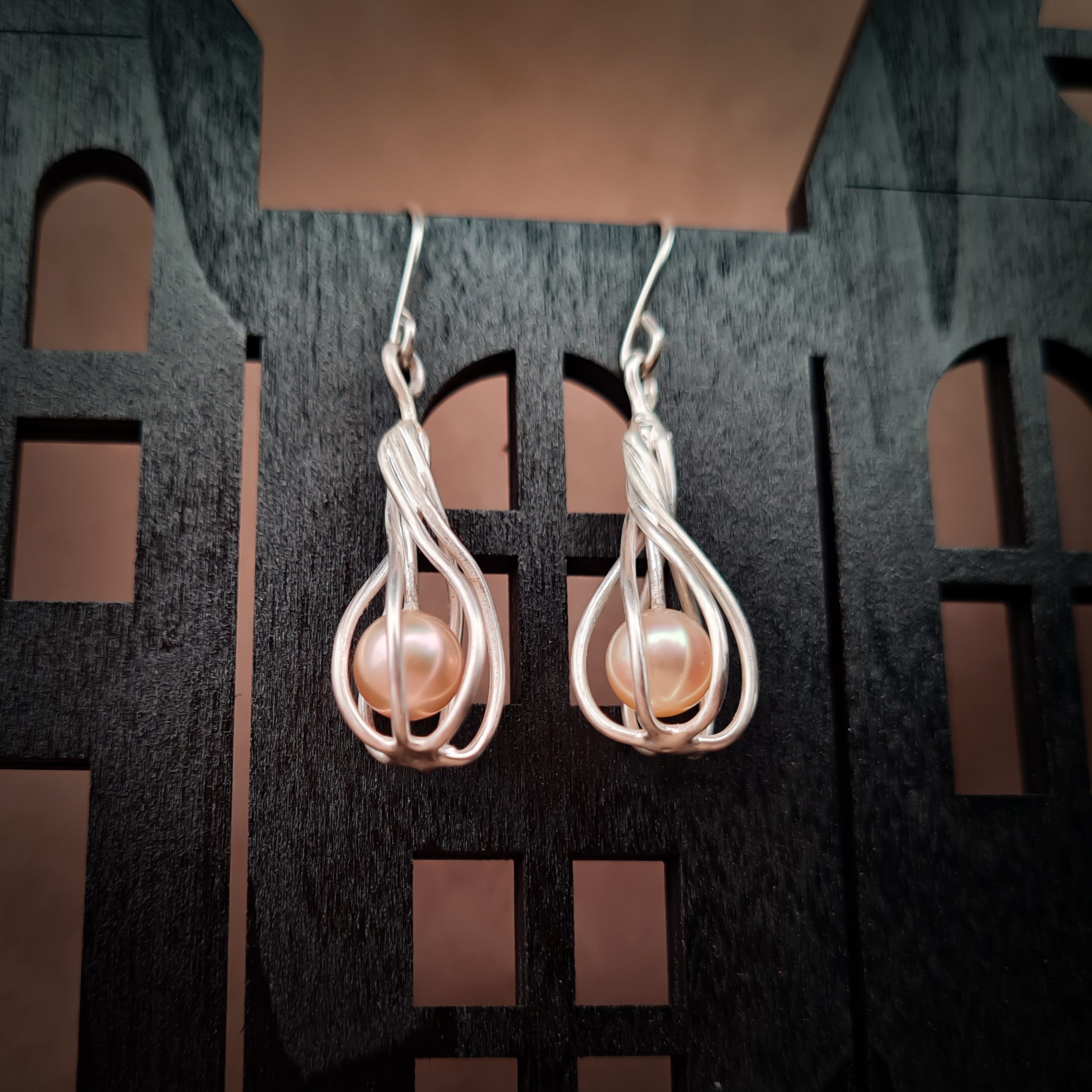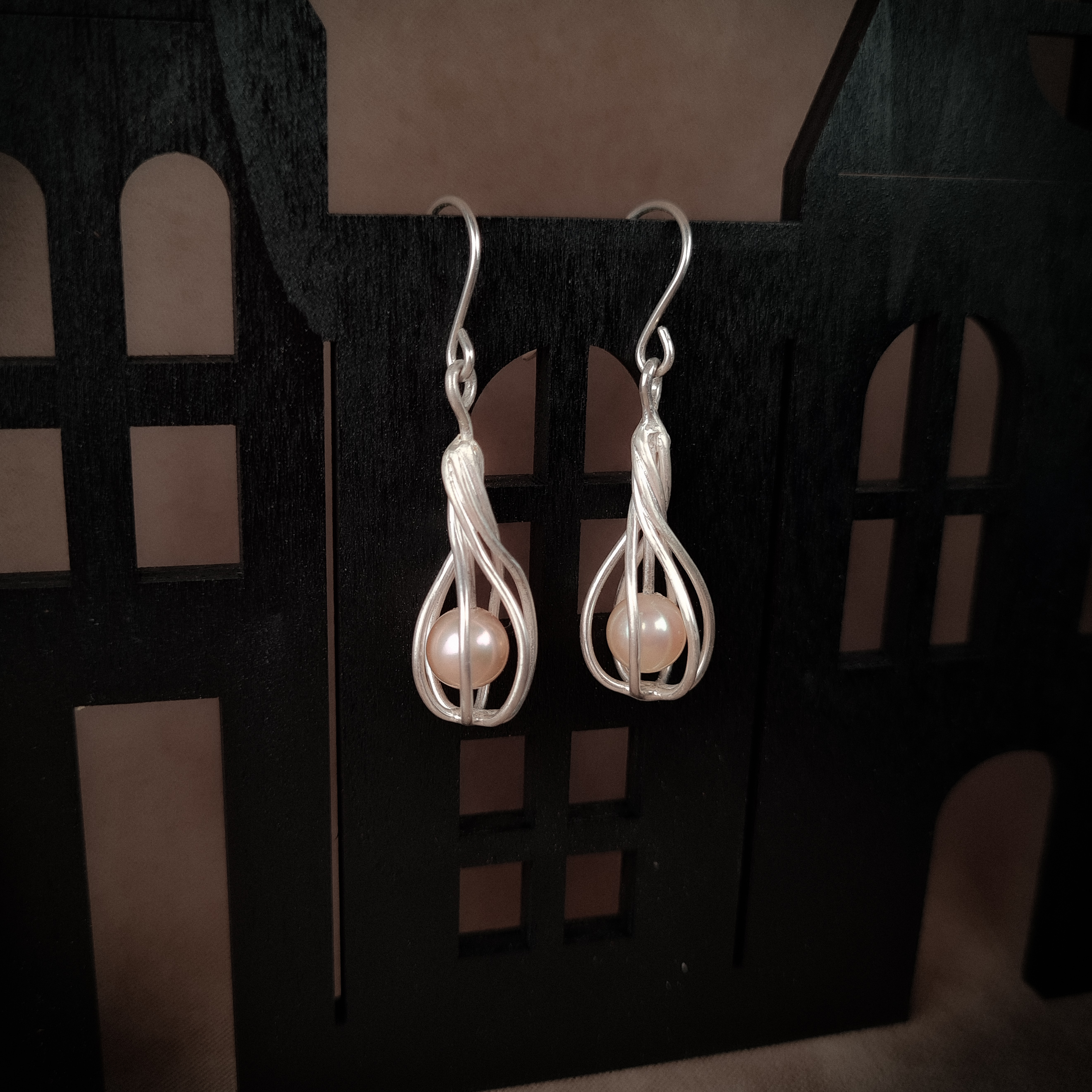 Das Silber wickelt sich in einer leichten Spirale um die Perle, welche an einem kleinen Silberdraht in der Luft gehalten wird. Dadurch sieht es aus als würde die Perle schweben.