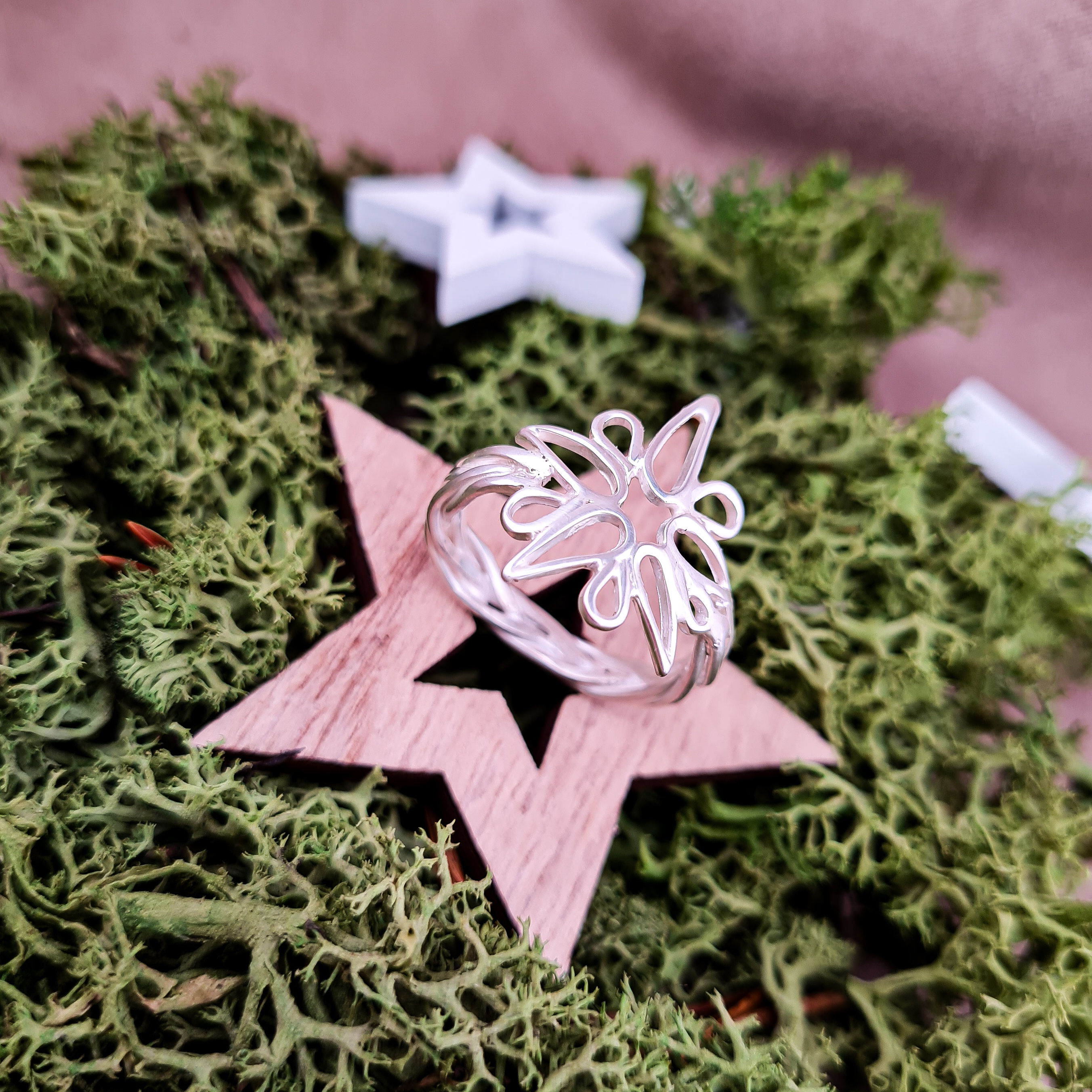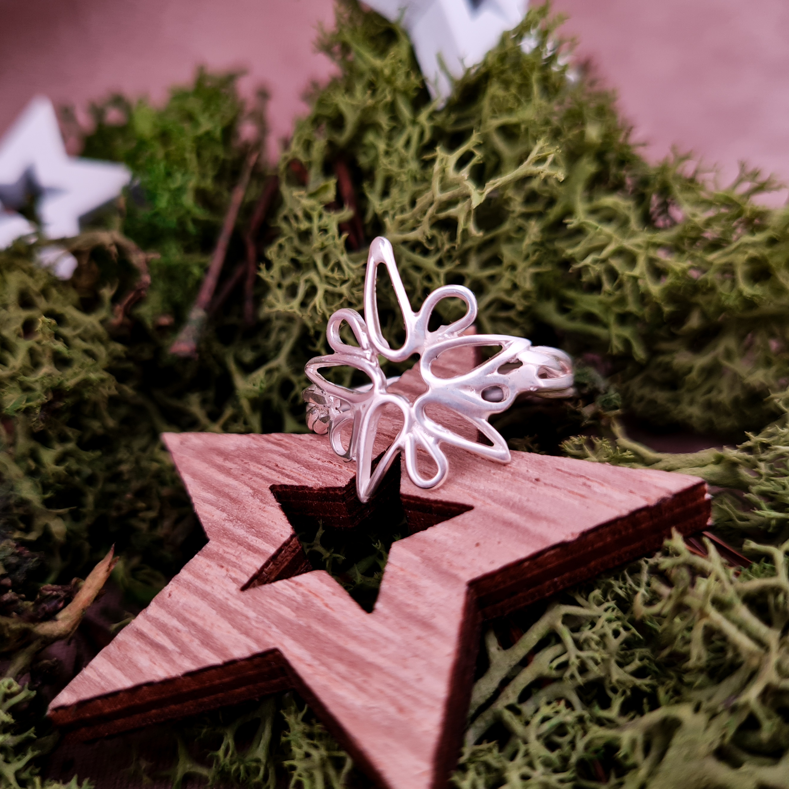 Die Ringschiene besteht aus mehreren Silberdrähten die miteinander verflochten wurden. Das Hauptelement ist der Stern, welcher liebevoll aus einzelnen Elementen zusammengefügt wurde.